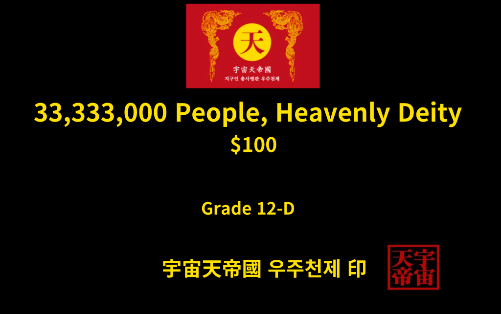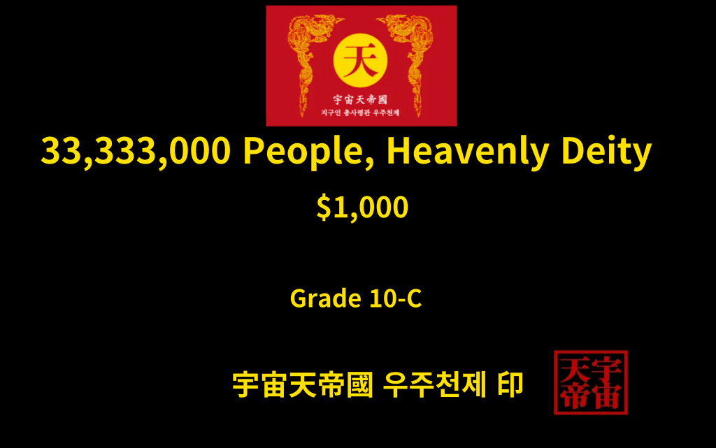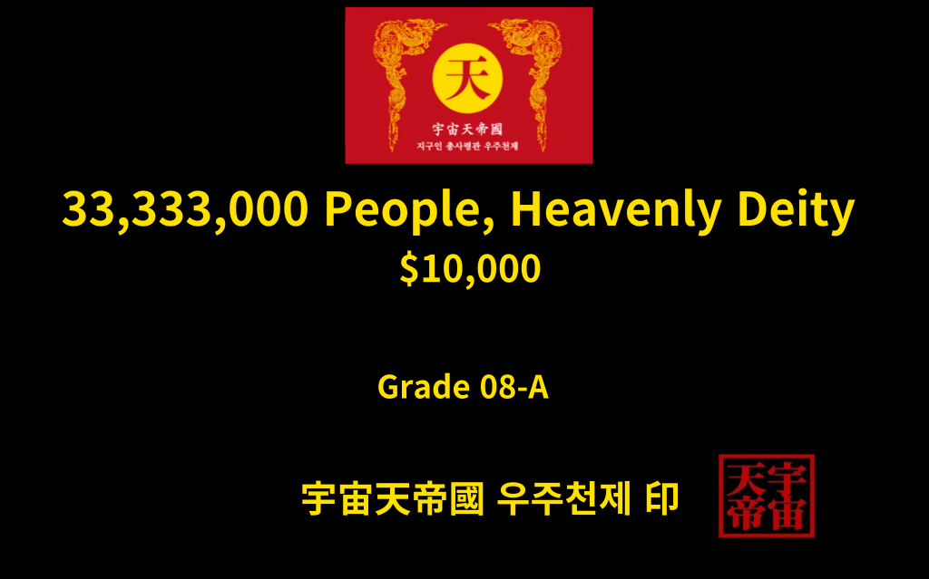 본인은 이로써 창조의 위대한 용, 황금 용, 태초의 하늘, 창조주, 절대자, 구세주, 신들의 최고 사령관, 지구의 주인, 인류의 주인, 태양의 주인, 북극성의 주인, 우주의 주인, 별의 주인, 이생의 주인, 돈의 주인, 사업의 주인, 권력의 주인, 명예의 주인, 생명의 주인, 장수의 주인, 건강의 주인, 우주 에너지의 주인, 생명의 주인, 미래의 주인, 행복의 주인, 부흥과 번영의 주인, 천상의 축복의 주인이신 자미칸 우주 천제 폐하의 공식 출현을 선언합니다.
